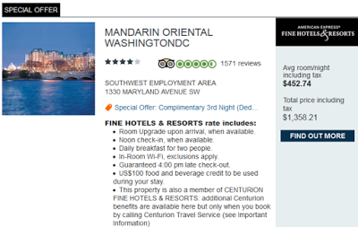 Offer是住二送一,第三晚免费。房价是260美金一晚(税前)。所以说相当于520美金住3晚。黑卡有个CFHR,跟白金卡FHR基本权益相当。除了包早餐,含网,提前check in, 4pm late check out,房型升级外(黑卡是必升一级)和100美金饭券。黑卡比白金卡多了一项权益,就是酒店额外送200美金饭券,所以我一共有300美金饭券。相当于不到80美金住华盛顿文华东方,还包早餐。